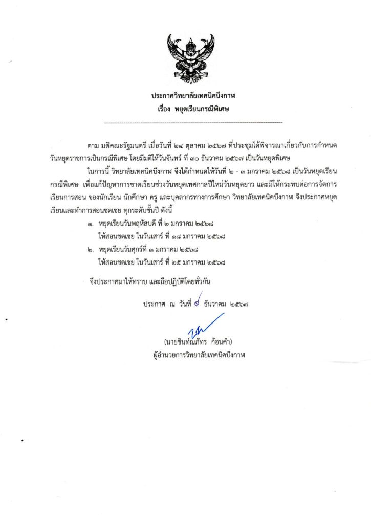 ข่าวประชาสัมพันธ์ การหยุดเรียนกรณีพิเศษ และการสอนชดเชย ธันวาคม 17, 2024 admin ประกาศ #วิทยาลัยเทคนิคบึงกาฬเรื่อง การหยุดเรียนกรณีพิเศษ และการสอนชดเชย หยุดเรียนเป็นกรณีพิเศษ วันที่ 2-3 มกราคม 2568 จำนวน 2 วัน จัดการเรียนการสอนชดเชย วันเสาร์ที่ 18 มกราคม 2568 วันเสาร์ที่ 25 มกราคม 2568----------------------------#PR_BKTC#เรียนดีมีความสุข#สอศ.