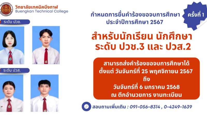 ข่าวประชาสัมพันธ์ นักศึกษา ระดับชั้น ปวช.3 และ ปวส.2 ส่งเอกสารคำร้องขอจบการศึกษา ประจำปีการศึกษา 2567 พฤศจิกายน 28, 2024 admin ประกาศวิทยาลัยเทคนิคบึงกาฬ#ให้นักเรียน นักศึกษา ระดับชั้น ปวช.3 และ ปวส.2 ส่งเอกสารคำร้องขอจบการศึกษา ประจำปีการศึกษา 2567ตั้งแต่วันจันทร์ที่ 25 พฤศจิกายน 2567 ถึง วันจันทร์ที่ 6 มกราคม 2568รายละเอียดเพิ่มเติม :