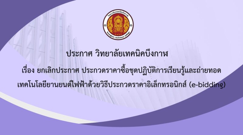ข่าวประกาศจัดซื้อจัดจ้าง กรกฎาคม 18, 2025 admin ประกาศ วิทยาลัยเทคนิคบึงกาฬ เรื่อง ยกเลิกประกาศ ประกวดราคาซื้อชุดปฏิบัติการเรียนรู้และถ่ายทอดเทคโนโลยียานยนต์ไฟฟ้าด้วยวิธีประกวดราคาอิเล็กทรอนิกส์ (e-bidding) Read More